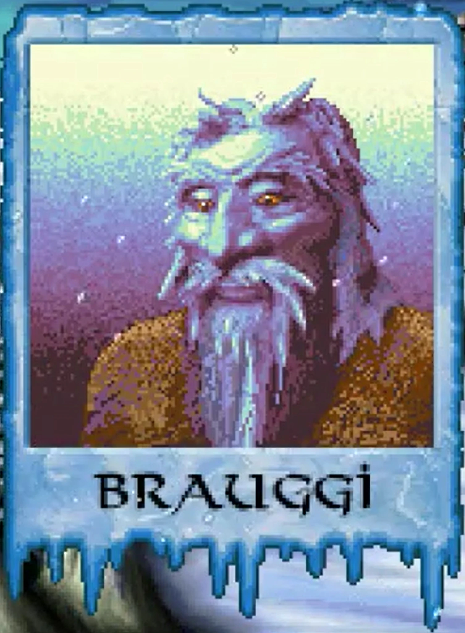 Brauggi is a frost giant (Jotunn) who has come to Jarnvidr to serve Egther. While he loves apples, he is loyal to serving his master and will not be bought.